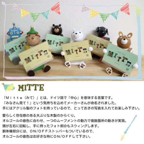 大切な写真を、かわいく飾りながら音色も楽しめる― そんな癒しのアイテムがこちらの「Mitte~ミテ~」です。木製の人形が、オルゴールの優しい音色に合わせて首と手をゆらゆらと揺らします。愛らしい動きが、見る人の心を和ませてくれます。L判サイズの写真がぴったり入るフォトフレーム付きで、お気に入りの一枚を飾るのにぴったり。お子様の誕生日の記念や、ペットの思い出写真、ご家族の笑顔を飾るのにおすすめです。