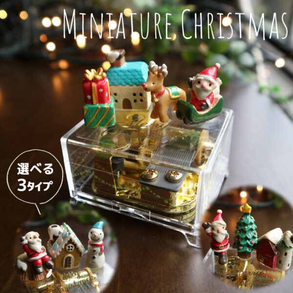 サンタがやってくるミニチュアの世界! 小さなクリスマスが詰まった、かわいらしいオルゴールです。透明なケースの上には、サンタや雪だるま、ツリーやおうちなど、心温まるミニチュアの世界が広がります。 キラキラと輝く金色のムーブメントが、やさしい音色とともにホリデー気分を演出。インテリアにもぴったりで、贈り物にもおすすめです。 手のひらサイズで、クリスマスのわくわくをそっとお部屋に届けます。