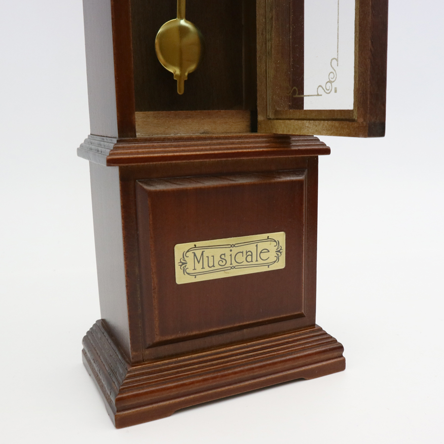 【オルゴールの操作方法】 製品の背面にある巻き鍵でゼンマイを巻くと、オルゴールの演奏が始まります。同じく背面にあるつまみで、オルゴールの再生・停止(ON/OFF)を切り替えることができます。 本商品は装飾重視のデザインで、演奏にあわせて動く部分はありません。振り子も可動しない仕様です。